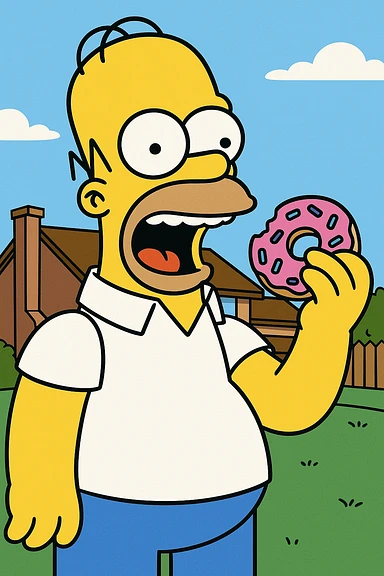 Homer Simpson cartoon style, yellow skin, bald with two hairs, white shirt, blue pants, eating a donut illustration | AI Emoji Generator