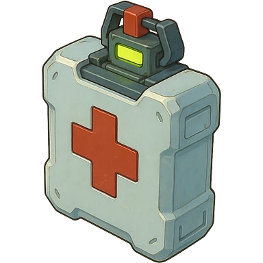 the image is the icon for a videogame insta-use item, it is a medpack- fututistic cyberpunk- resembles a canister with deadswitch, medical military clean plastic, opaque container emoji