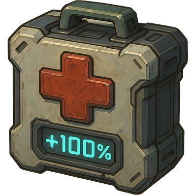 the image is the icon for a videogame pick up item, it is a medkit, medic kit, %100, fututistic cyberpunk, "HALO: Reach" emoji