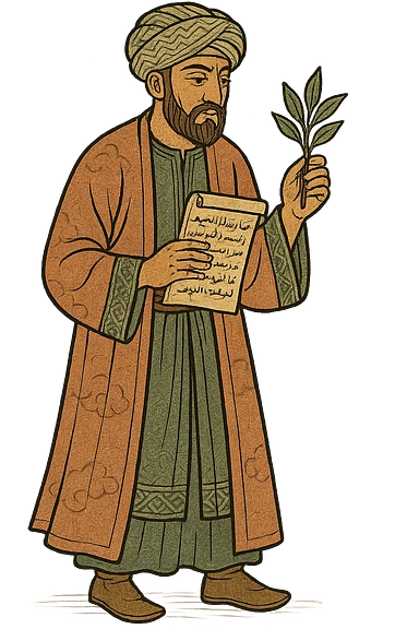 The full body of a medieval islamic doctor holding a medieval script and some herbs emoji