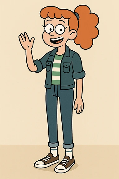 A girl Orange curly ponytail white green stripes ddre sshair jacket jeans blue sports striped socks brown converse women's chuck taylor all star shoreline slip on casual shoe wave and say hello emoji