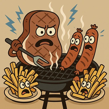 beef sirloin steak sausages on a bbq french fries potato plates emoji