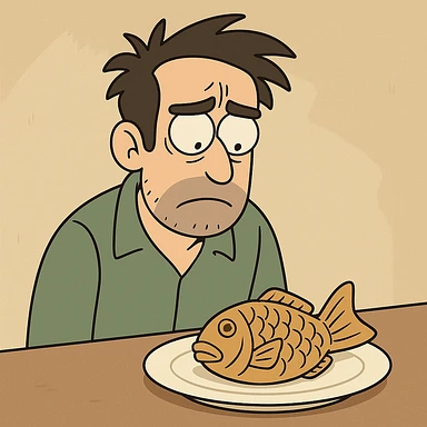 cartoon-style person holding a plate of food, looking uncertain, expressive face, clear body language emoji