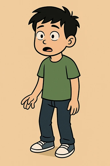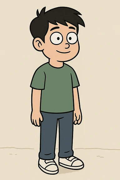 Chinese boy black hair green t-shirts dark blue jeans white shoes emoji