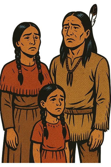 The full body of a native american father his daughter from the 1880s standing up straight with their heads held high but looking sad. bOTH ARE LOOKING IN THE SAME DIRECTIONillustration