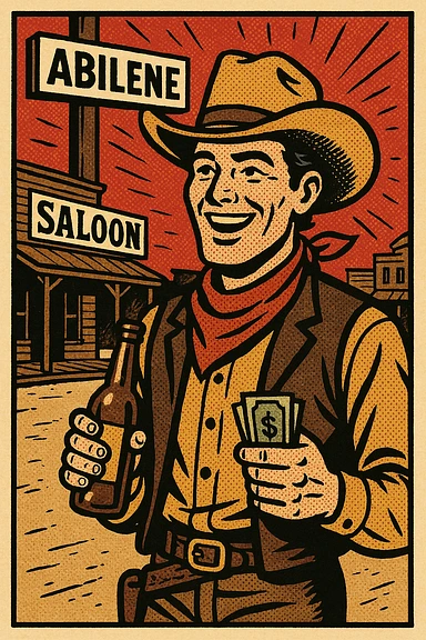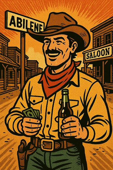 An American West cowboy standing in the Wild West town of Abilene in front of a saloon. There is a street sign saying Abilene. The cowboy is holding a bottle of beer and his pay looking happy. emoji