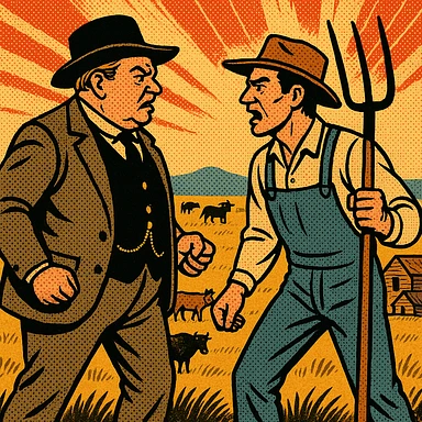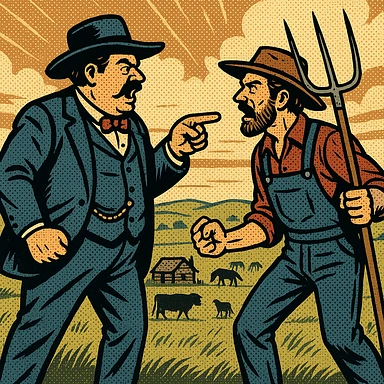 The full body of a wealthy cattle baron from the 1870s American West in an argument facing a homestead settler holding his pitch fork. In the background is the Great Plains with cattle and horses emoji