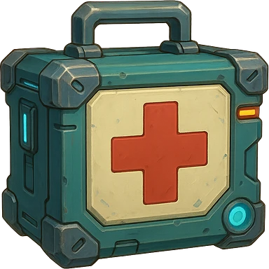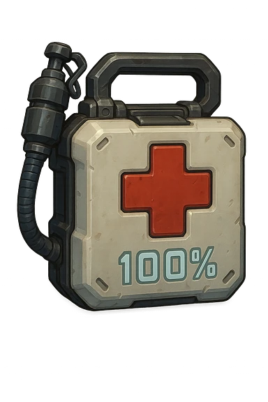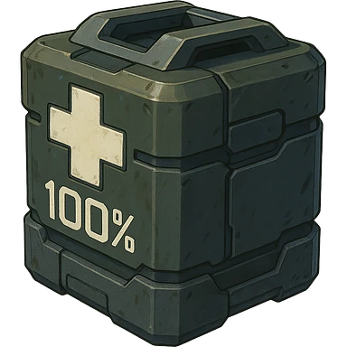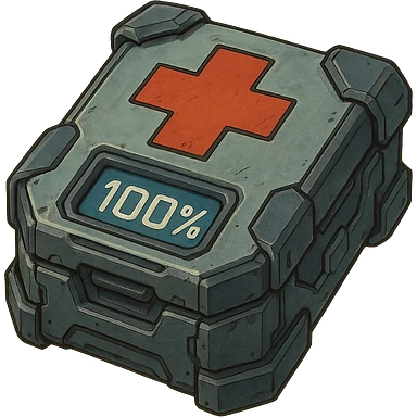 the image is the icon for a videogame pick up item, it is a medkit, medic kit, %100, fututistic cyberpunk, style of: "HALO: Reach" , quake, Marathon illustration | AI Emoji Generator