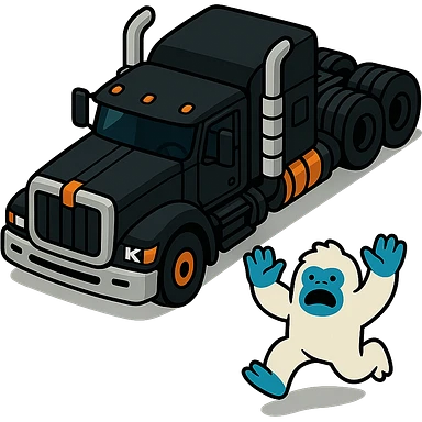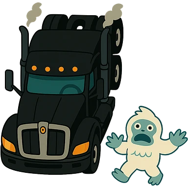 top-down animated style of a modern black Kenworth W680 flat top semi sleeper with stacks chasing a small yeti abominable snowman down a highway, fun and lively, no text illustration | AI Emoji Generator