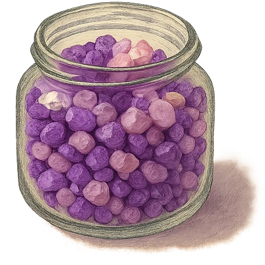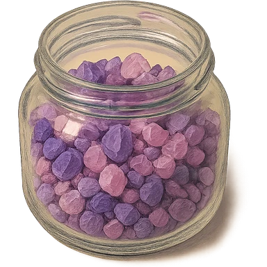 very realistic purple and pink crystal small rough pebbles in an open glass jar, mixed together, natural colors, soft, fairy-like atmosphere, no background, square size illustration | AI Emoji Generator