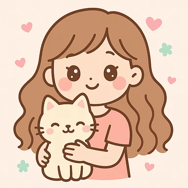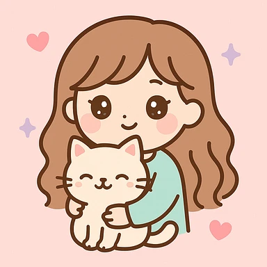 a girl with long wavy brown hair and brown eyes holding a cat, friendly and appealing style emoji