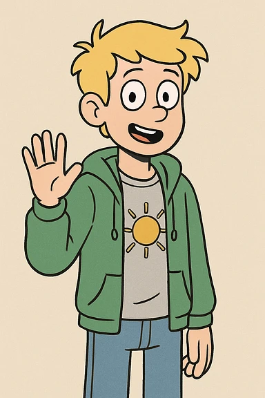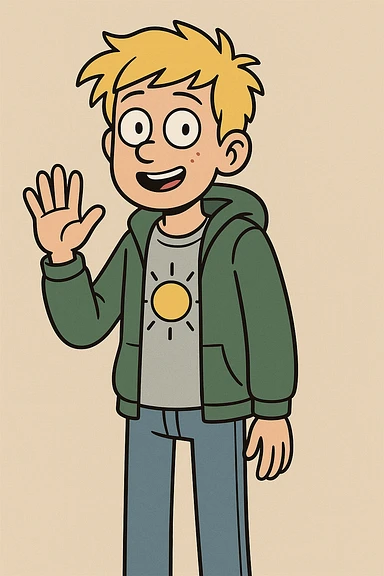 A boy yellow hair grey t-shirt yellow sun green hoodie lights blue jeans a hand hello emoji