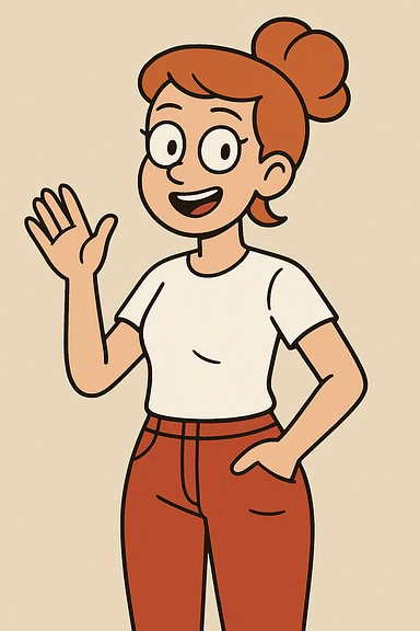 Girl dark orange hair bond hairstyle women's white t shirts pockets red trousers a hand hello emoji