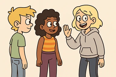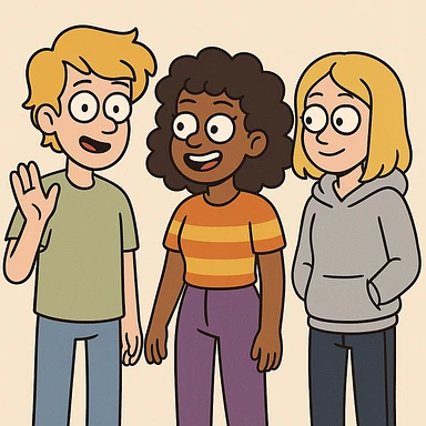 A boy dark yellow hair light green t-shirt white lightfo blue jeans girl brown skin black hair hairstyle curly hair yellow orange stripes top purple trousers girl yellow hair light grey hoodie dark blue jeans a hand hello emoji