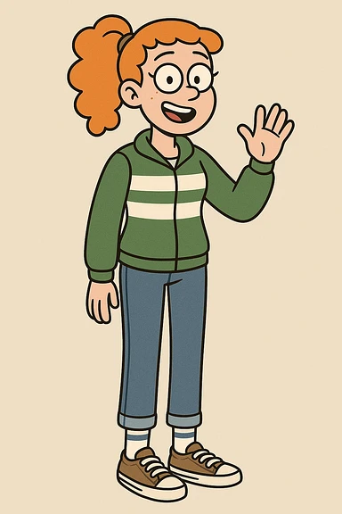 A girl Orange curly ponytail white green stripes ddre sshair jacket jeans blue sports striped socks brown converse women's chuck taylor all star shoreline slip on casual shoe wave and say hello emoji