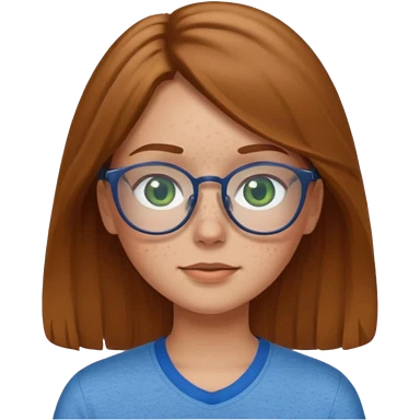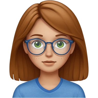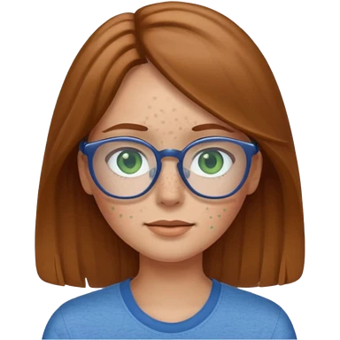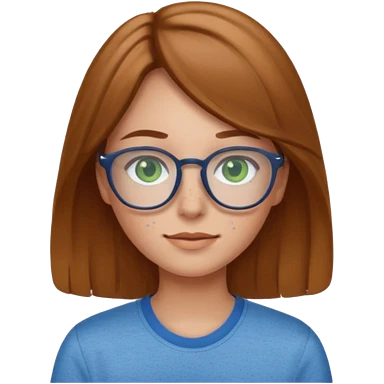 Create an emoji of a girl with light brown hair long length hair, green eyes, freckles, glasses and wearing a blue shirt emoji