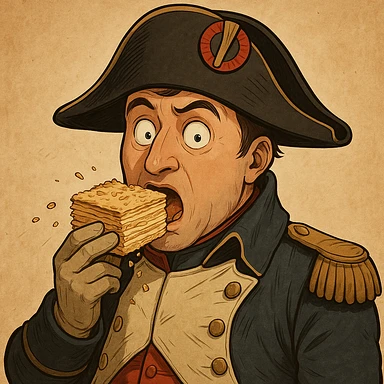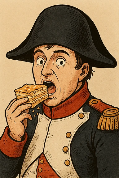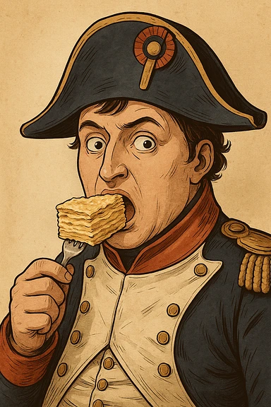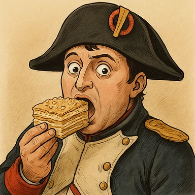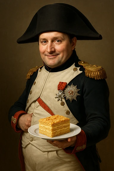 Используя похожую стилистику, слегка мультяшную, но при этом реалистичную - сгенерируй Наполеона, который довольно держит на тарелке торт наполеон, как бы демонстрируя его зрителюimage