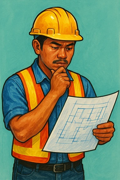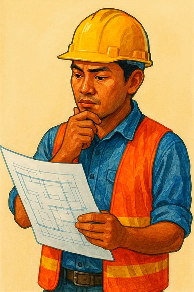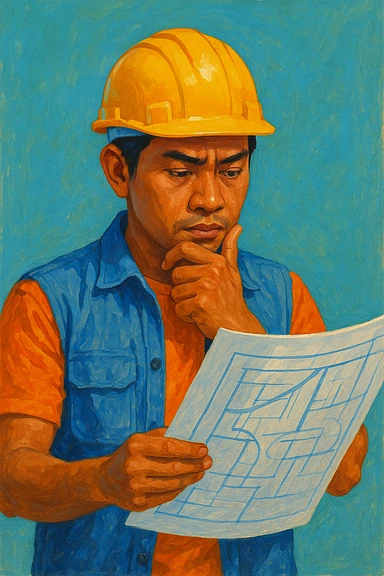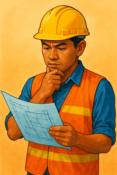 Сгенерируй мне индонезийца в чуть рисованном стиле, в каске и с чертежом в руках. По пояс. На однородном фоне. Он строитель и смотрит в чертеж и думает. Ярко, красиво, красочно emoji