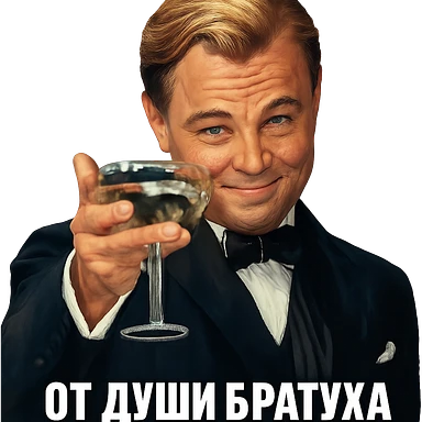 Герой на фотографии в позе и выражением лица из знаменитого мема с Ди Каприо из Великого Гэтсби, слегка рисованный, но при этом реалистичный объемный стиль, прозрачный фонimage