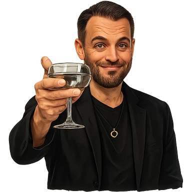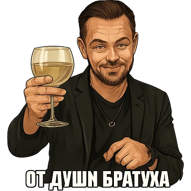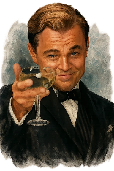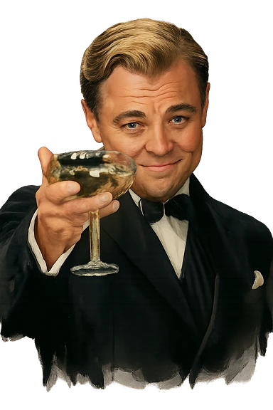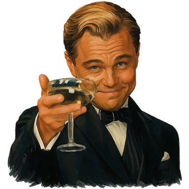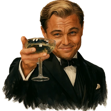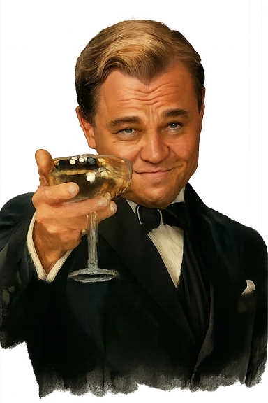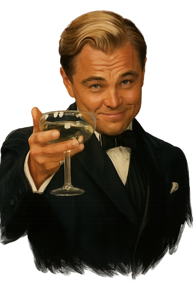 Герой на фотографии в позе и выражением лица из знаменитого мема с Ди Каприо из Великого Гэтсби, слегка рисованный, но при этом реалистичный объемный стиль, прозрачный фон image | AI Emoji Generator