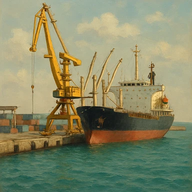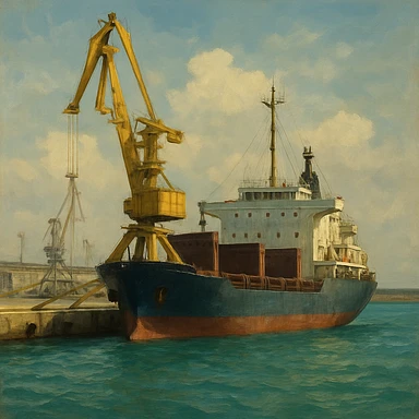 фотография современного торгового порта на берегу моря. На переднем плане — большой грузовой корабль у причала, рядом высокий портовый кран жёлтого цвета. Вода бирюзовая, слегка волнистая, на фоне виден бетонный волнорез и небо с мягкими облаками. Композиция сбалансирована: корабль справа, кран слева. Освещение дневное, естественное, с мягкими тенями. Атмосфера индустриальная, но спокойная, без людей. В СТИЛЕ РЕАЛИСТИЧНОЙ ЖИВОПИСИ на однородном фонеimage