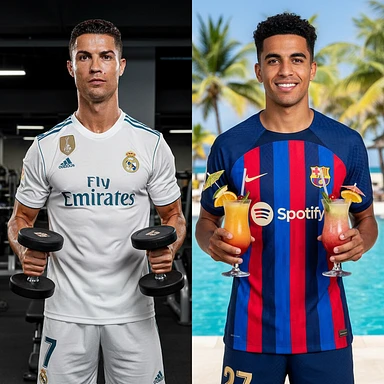 Криштиану Роналду в футболке Реала стоит с гантелями слева. А справа стоит Ламин Ямаль в форме Барселоны и с коктейлями в руках image | AI Emoji Generator