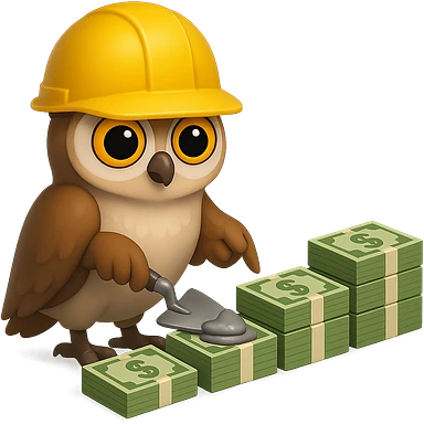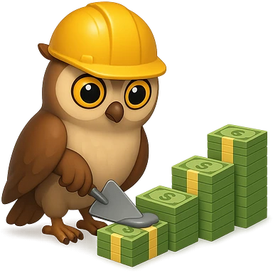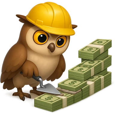 В стилистике эмоджи сгенерируй сову, она в строительно шлеме сосредоточено мастерком для цемента выкладывает пачки долларов по переднему плану будто они кирпичи, пачки идут в возрастающем порядке, картинка символизирует "управляемый рост выручки", прозрачный фон emoji