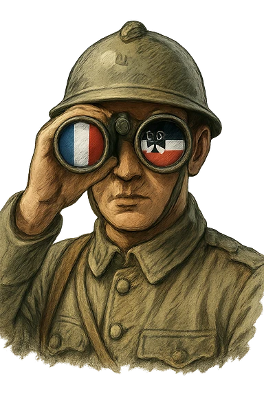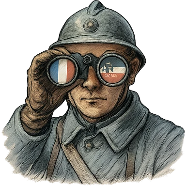 Военный времен Первой мировой смотрит прямо на зрителя в бинокль в одной линзе отражается французский флаг, в другой флаг Германской империи, слегка рисованный, но при этом объемный стиль, прозрачный фонimage