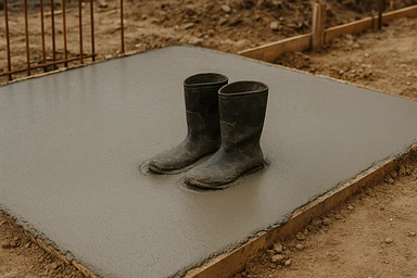 На строительной площадке видно застывший влажный бетон, он ровный и аккуратный залит как фундамент. В центре — пара старых резиновых сапог, частично утонувших и застывших в цементе, будто кто-то случайно оставил их тамimage