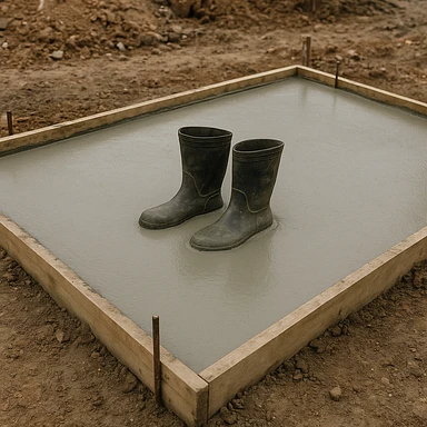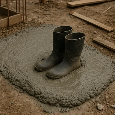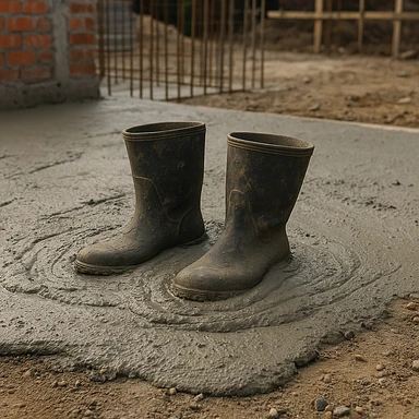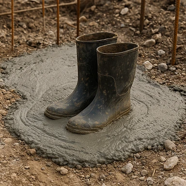 На строительной площадке видно застывший влажный бетон, он ровный и аккуратный залит как фундамент. В центре — пара старых резиновых сапог, частично утонувших и застывших в цементе, будто кто-то случайно оставил их там image | AI Emoji Generator