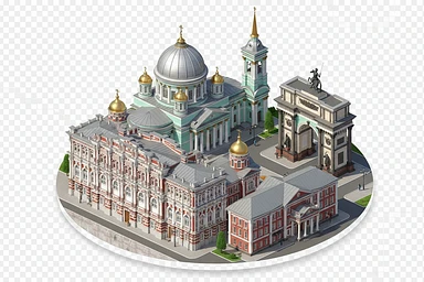 Изометричная, яркая, детализированная и фотореалистичная иллюстрация панорамы города Курска на круглой подставке, Знаменский собор, здание Дворянского собрания, Триумфальная арка в стиле 3D-коллажей городов, чёткие линии, слегка мультяшная стилистика, прозрачный фон, не обрезать края картинки emoji