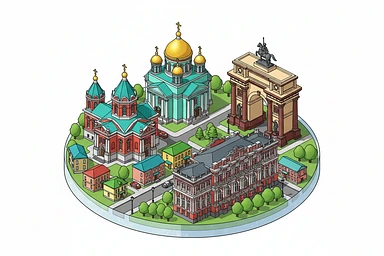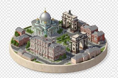 Изометричная, яркая, детализированная и фотореалистичная иллюстрация панорамы города Курска на круглой подставке, Знаменский собор, здание Дворянского собрания, Триумфальная арка в стиле 3D-коллажей городов, чёткие линии, объемная реалистичная стилистика, прозрачный фон, не обрезать края картинки emoji