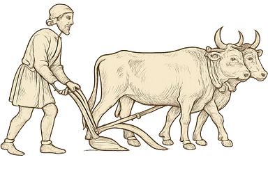 нарисуй строго в профиль средневекового мужчину с плугом и волами без фона