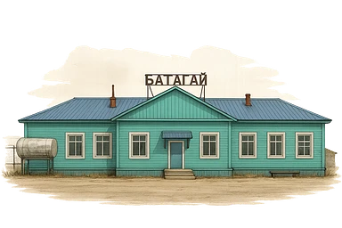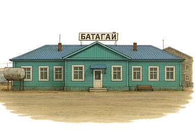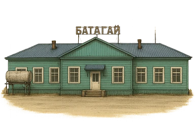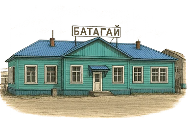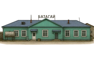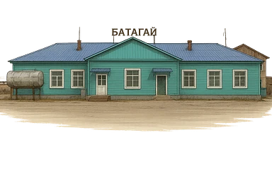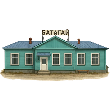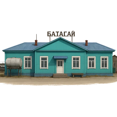 Используя эту стилистику, сгенерируй фотореалистичную картинку домика с надписью Батагай, прозрачный фон emoji