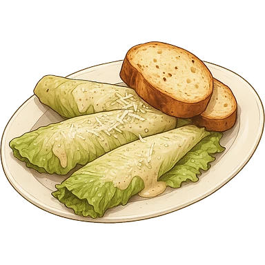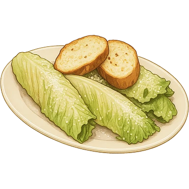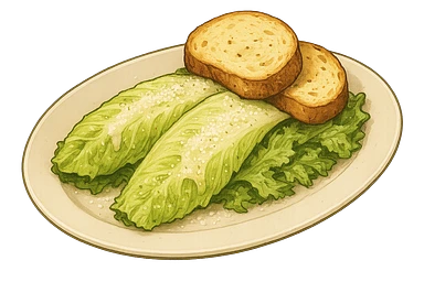 Используя такую слегка рисованную, но объемную стилистику сгенерируй оригинальную версию салата Цезарь как на картинке, прозрачный фон emoji