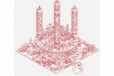 Изометричная, в красно-белых цветах, детализированная и фотореалистичная иллюстрация в стиле 3D-коллажей городов, аккуратные и чёткие линии, стилистика ретро-карт СССР. Чёткие контуры, высокое качество, прозрачный фон, не обрезать края картинки. В стиле картинки, которую я прикрепил emoji