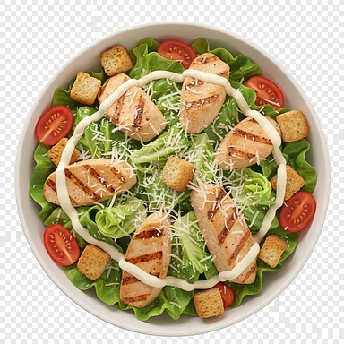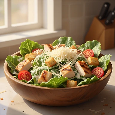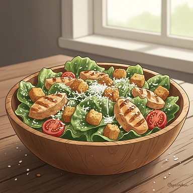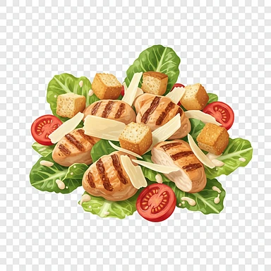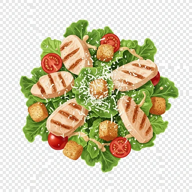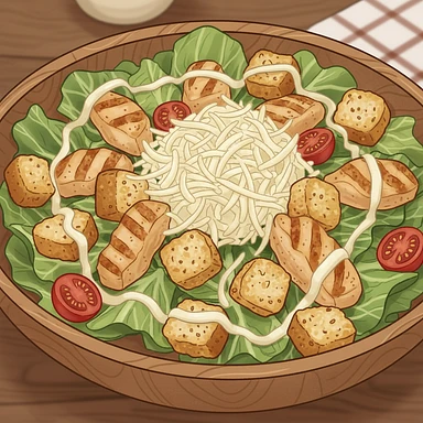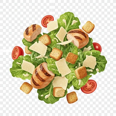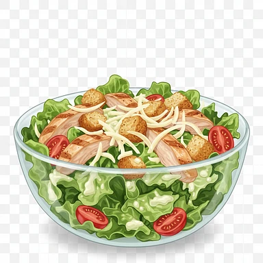 Используя похожую стилистику, слегка мультяшную, но при этом реалистичную - сгенерируй Салат Цезарь с фотореалистичными кусочками курицы, гренками, тертым сыром, несколько разрезанных помидорок черри, листья салата image | AI Emoji Generator