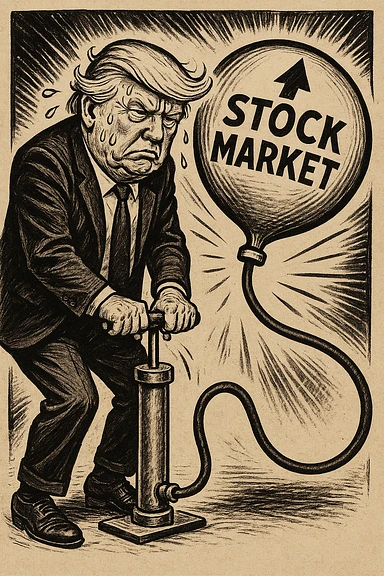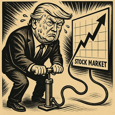 Дональд Трамп в стили пропагандисткой карикатуры в поте лица качает через насос, который подключен к фондовому рынку