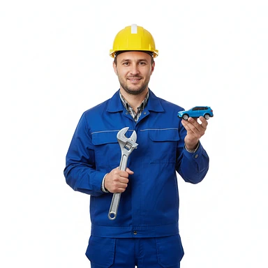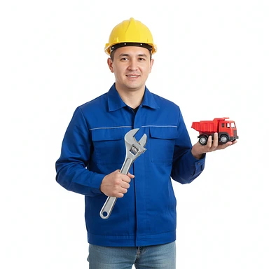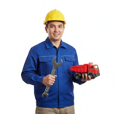 нарисуй узбека в строительной каске с ключом гаечным в одной руке и машинкой игрушечной в другой руке, без фона emoji