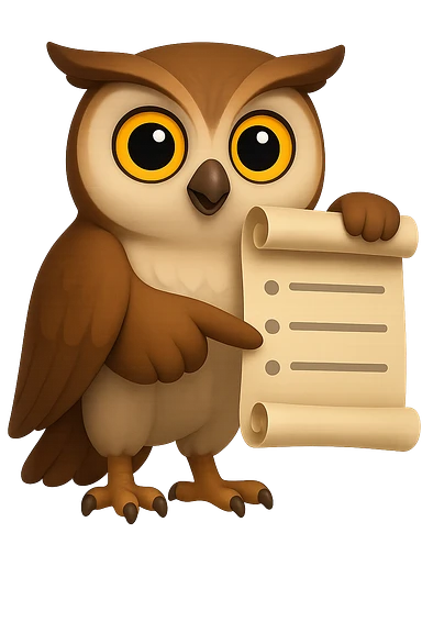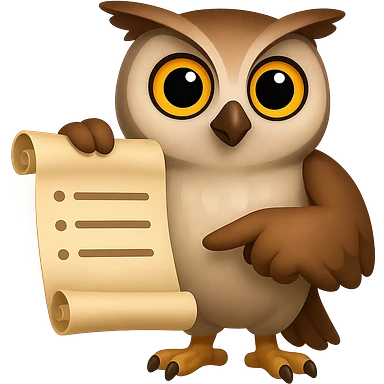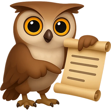 В стилистике эмоджи сгенерируй сову, она смотрит прямо на зрителя, в одном крыле она держит развернутый свиток, а другим указывает на пункты в нем, прозрачный фон emoji
