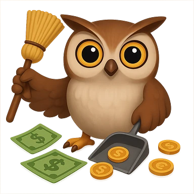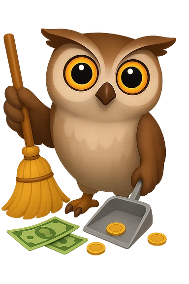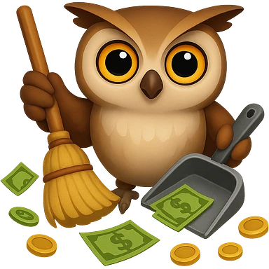 В стилистике эмоджи сгенерируй сову, она смотрит прямо на зрителя, одним крылом держит веник и сметает купюры и монеты в совок, который держит в другом крыле, прозрачный фон emoji
