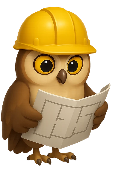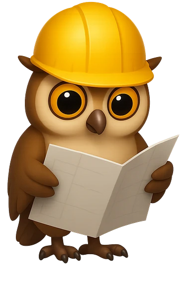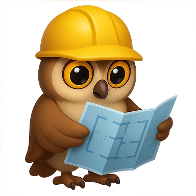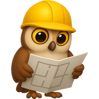 В стилистике эмоджи сгенерируй сову, которая увлеченно держит в крыльях развернутый план и смотрит в него, а на голове у нее каска строителя, прозрачный фон emoji