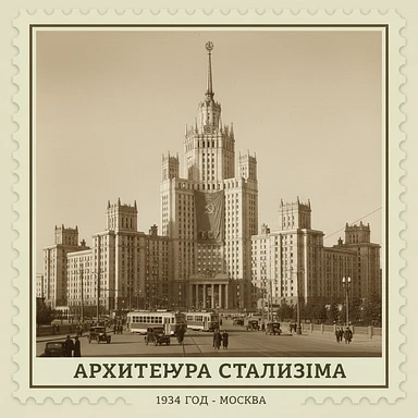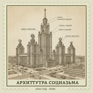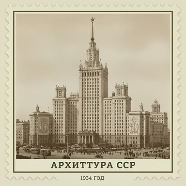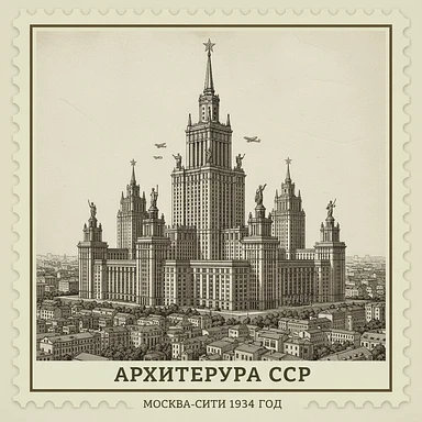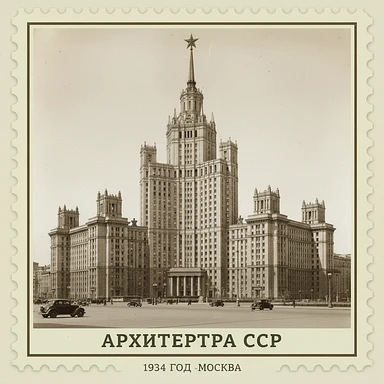 Серия небоскребов в стиле сталинский ампир, СССР 1934 год Стилизуй изображение под марку как на фото emoji