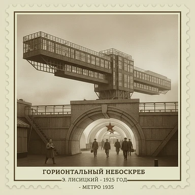 Горизонтальный небоскреб Эля Лисицкого плавно переходит в станцию метро Стилизуй изображение под марку как на фото emoji