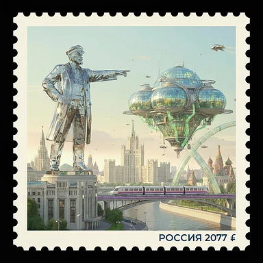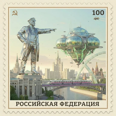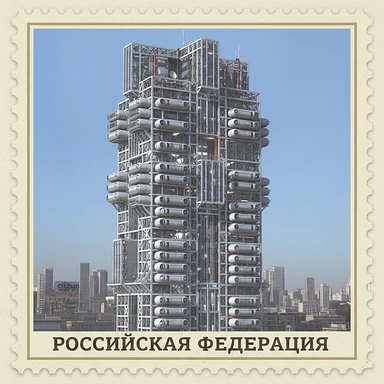 Замени изображение внутри марки на капсульный дом-коммуну конструктивизм 1920-е годы, из произведения "Мы" замятина emoji