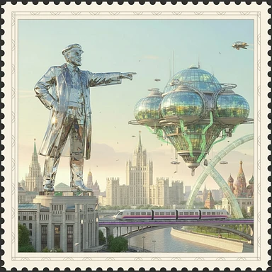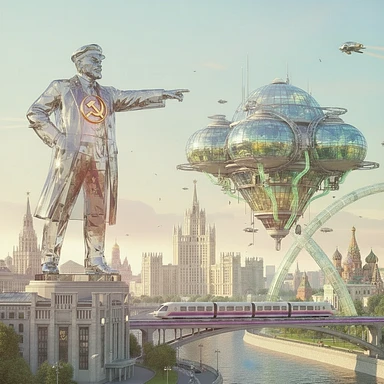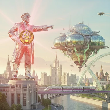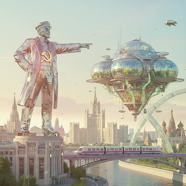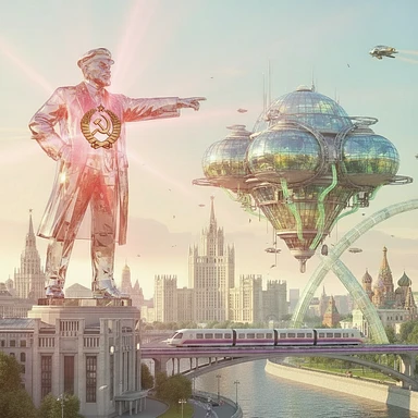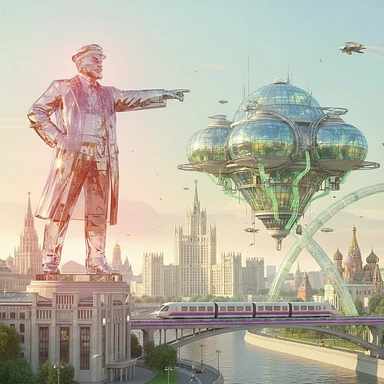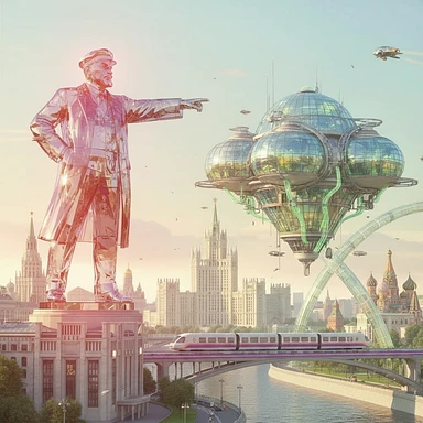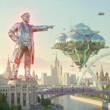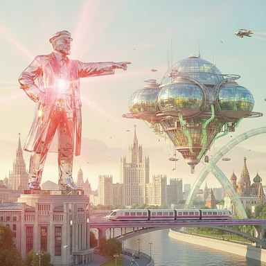 Замени фигуру девушки на стеклянную статую Ленина, который указывает рукой вперед Остальное оставь без изменений image | AI Emoji Generator