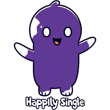 "happily single!" typography white color lettering on dark purple graphic tshirt, isolated. No emoji icons, no emoji faces, no human figures, 4k hd quailty emoji