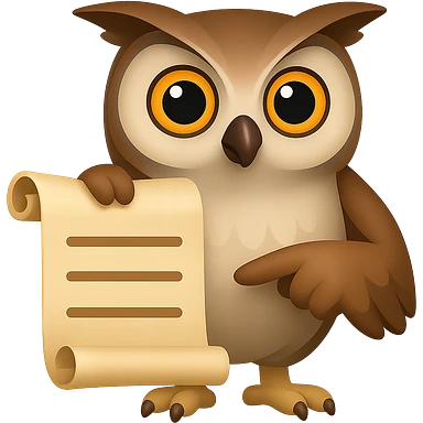 В стилистике эмоджи сгенерируй сову, она смотрит прямо на зрителя, в одном крыле она держит развернутый свиток, а другим указывает на пункты в нем, прозрачный фон emoji