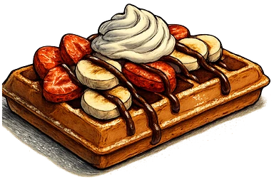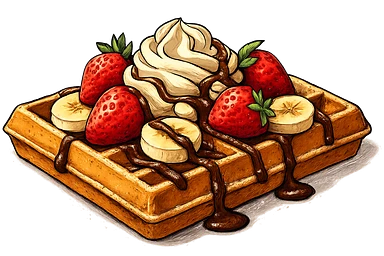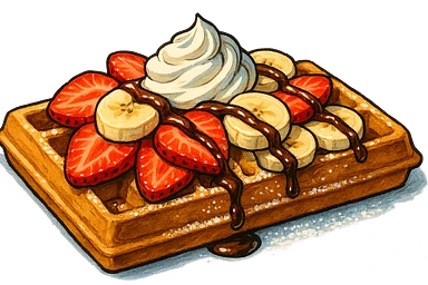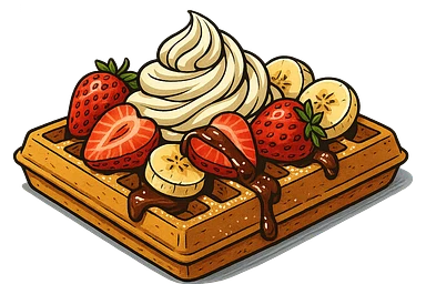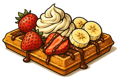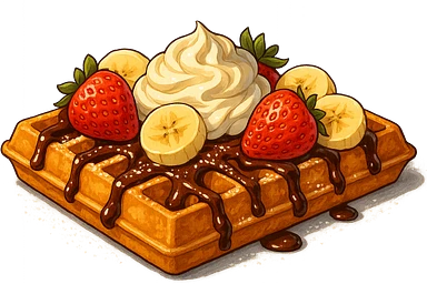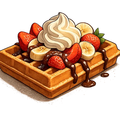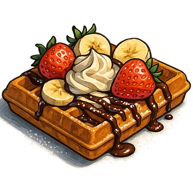 В слегка рисованном, но при этом ярком и объемном стиле с четкими линиями составь композицию, где горизонтально лежит классическая брюссельская вафля с клубникой и бананом, сливочными кремом, политая шоколадом и посыпанная сахарной пудрой, профессиональный свет, подчеркивающий объем, сделай картинку более широкой, прозрачный фон image | AI Emoji Generator