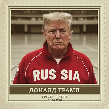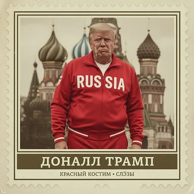 Дональд Трамп в спортивном красном костюме RUSSIA очень грустный плачет. Цветное фото Стилизуй под такую марку emoji